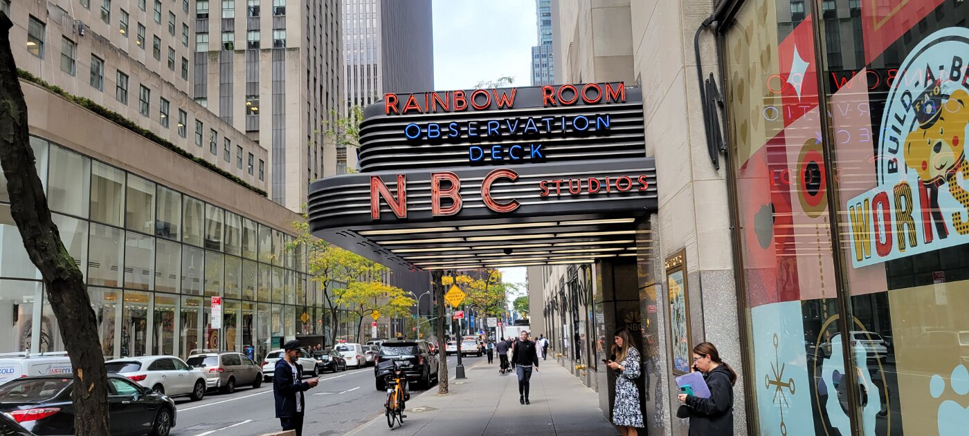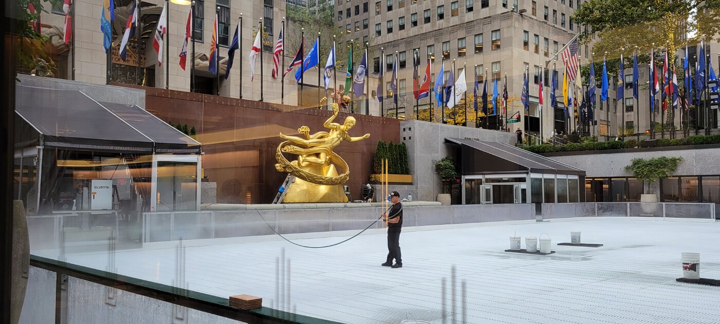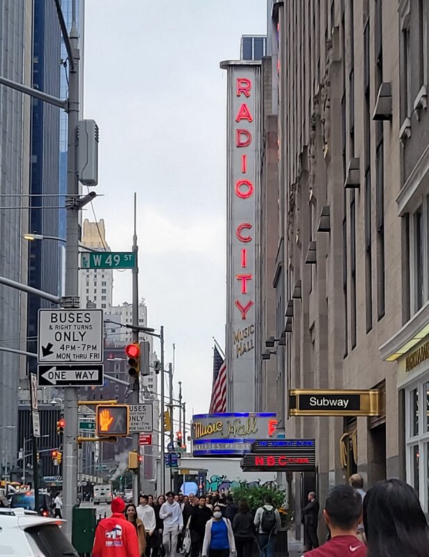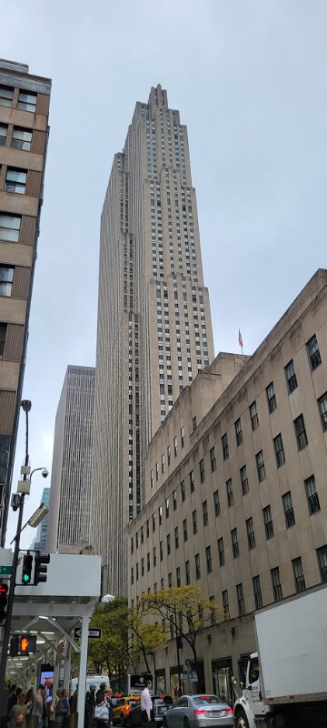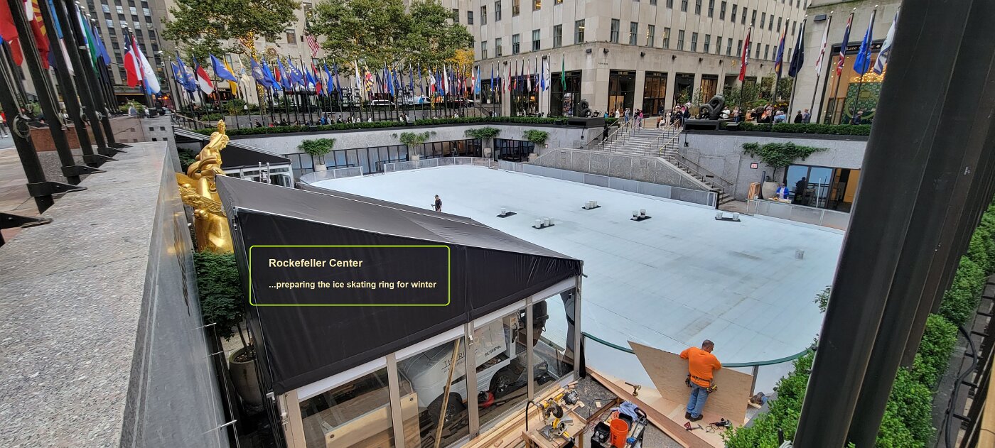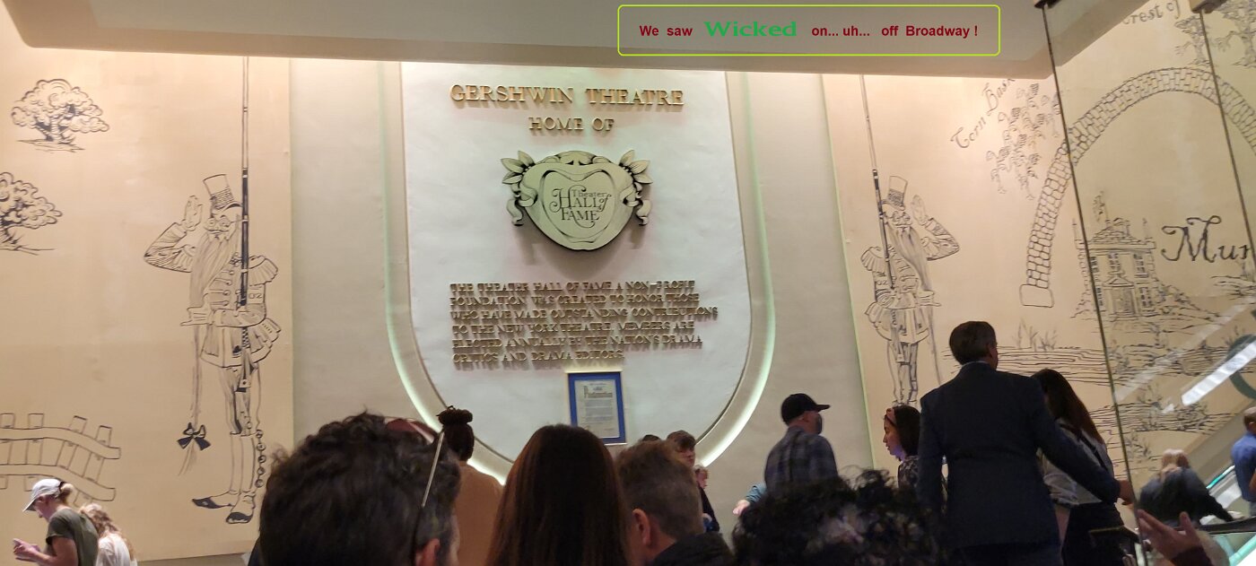 Fifth day afternoon, walked around downtown, went to Rockefeller Center to see ice ring being made up. Went to FAO Schweetz toy store. Then we saw 'WICKED' off Broadway, what a performance and show. Rode the cable car over to Roosevelt Island for dinner. Ended up at the top of the Empire State Building - was a windy night.