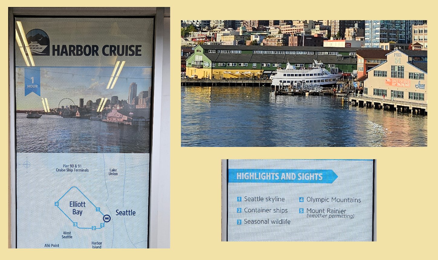 We rode the bus to Pike Place Market and walked around, even saw the Gum Wall. Then took a Harbor Tour to see the City and sights from the water view, this was fun but overcast day. In the afternoon, took the bus south of the city to the Museum of Flight, neat displays from a Concorde to the first Air Force One to early Space stuff. Back to the hotel and enjoyed our nightly view of Lake Union and the Needle.