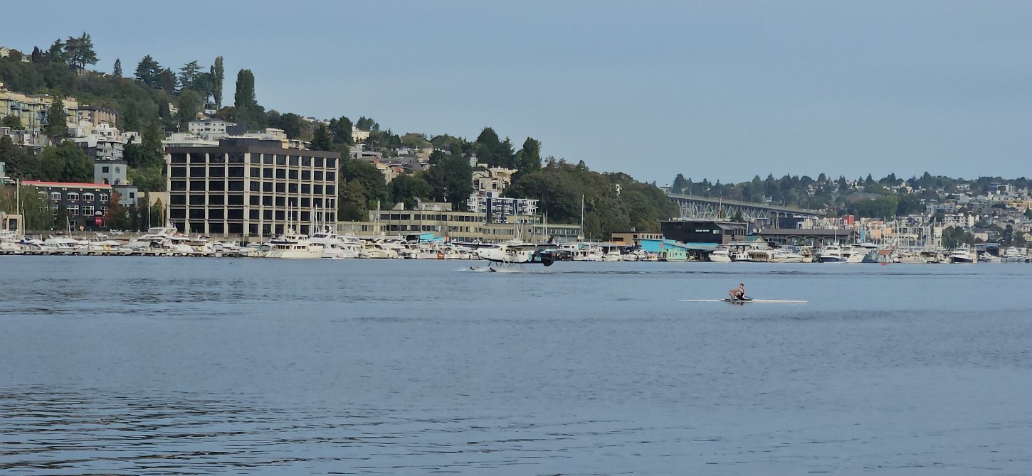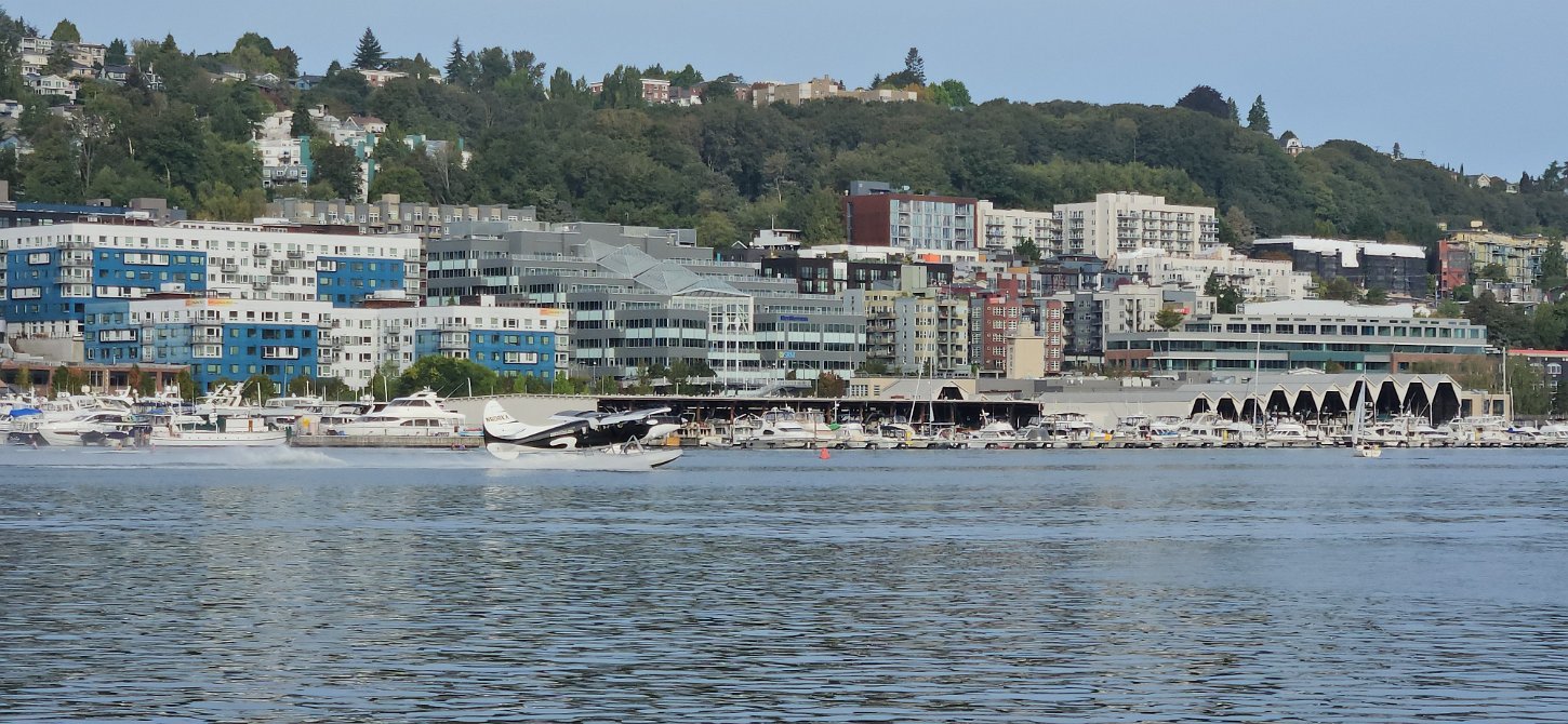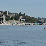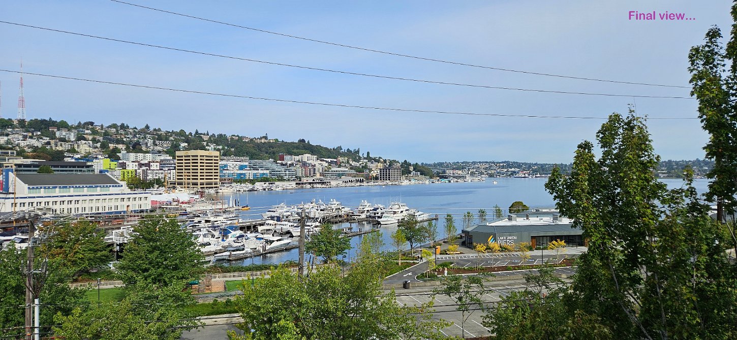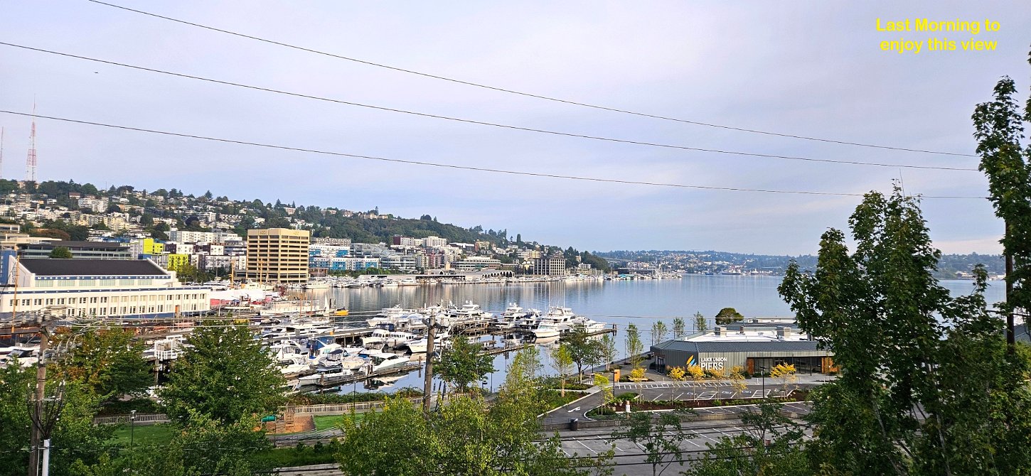 Our last day in Seattle, final views of Lake Union from our rooms patio view, and breakfast in the hotel courtyard again. We walked around the boat docks once more, watched some Sea Planes land and take off. The sun sorta came out even for a clear day. Last photos, note the Lite Rail tracks merge, past our hotel, so the unit can reverse and go the other way, via other track.