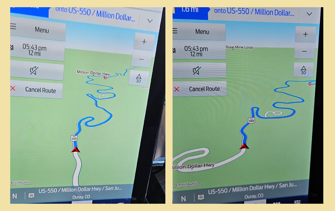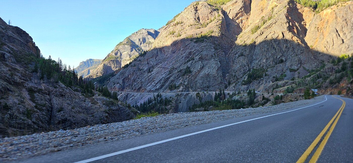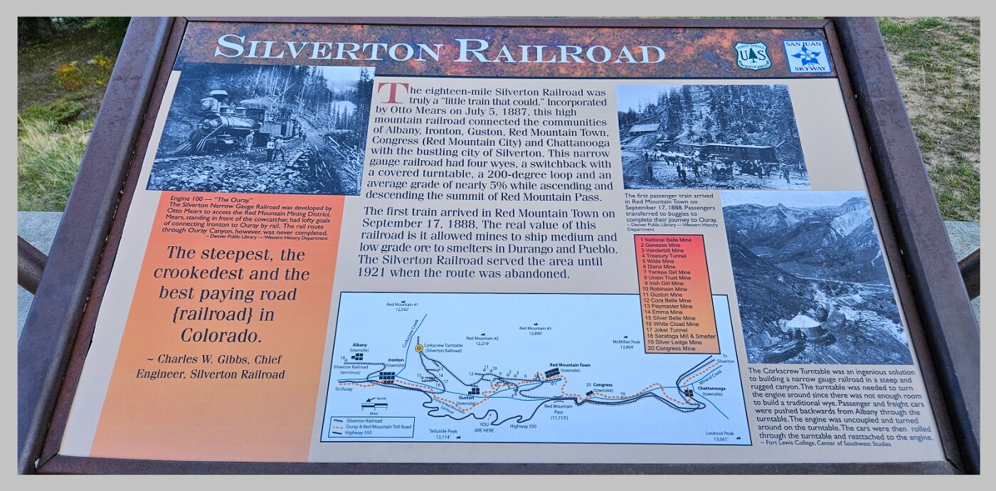 Afternoon of the fifth day, we drove over to Ouray and back, via the Million Dollar Highway. Great views, deep breaths, oh what a drive it was. There is not a good count of the curves (so many). The route goes over Red Mountain Pass and thru the Red Mountain Mining District, rich with history.